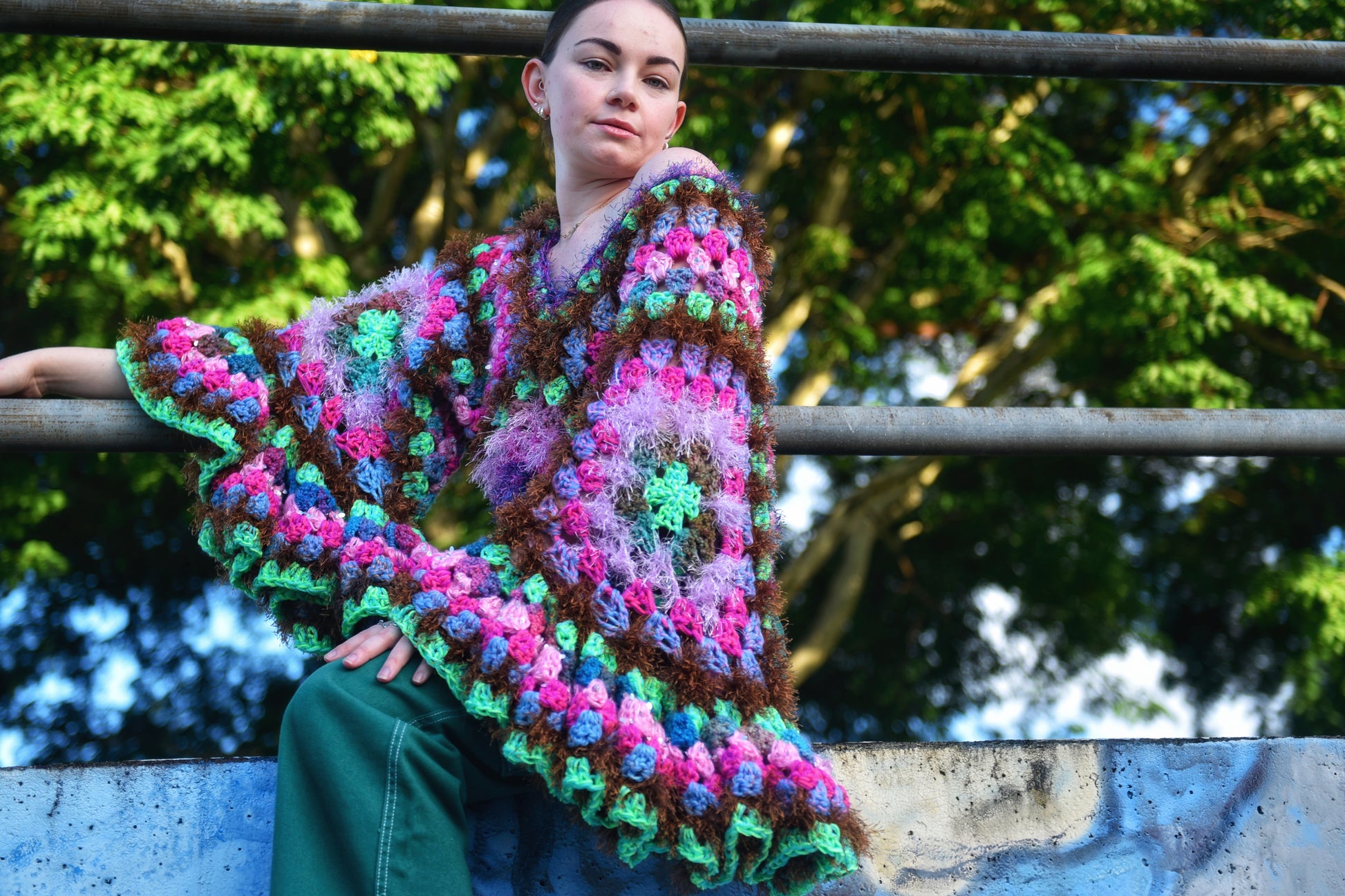 “4am” was named after ColourPuff Girl’s favourite time of day. At 4am the studio is its most peaceful, basking in the morning sun and bursting with rainbows. At 4am Colourpuff Girl feels the most alive and creative. The colours are a play on feeling cozy and comfortable wrapped up in blankets having a sleep in versus early morning energetic starts. The contrast between the fluorescent and muted tones adds to the electricity of this piece. The ruffle sleeves flow like morning light bursting through the trees and if you’re feeling magical you can twirl and watch them swirl with you.