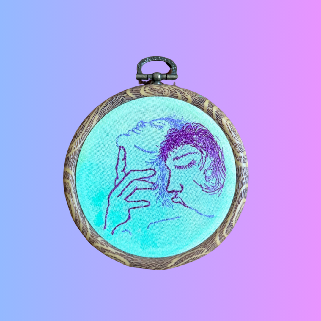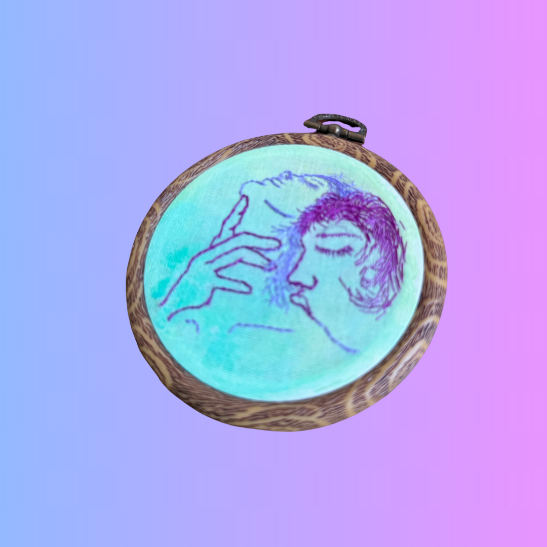 "Afternoons with Her " is a set of three embroiderys apart of the collection "The Tale of The Two Violets" which debuted at Melt Fest at "Sexy Gay Art" in 2025. This was ColourPuff Girls first wall art show and the collection of embroideries told the story of finding her first queer relationship. This collection celebrates sapphic love and heartbreak. It's colourful, sparkly and hand embroidered with so much love.