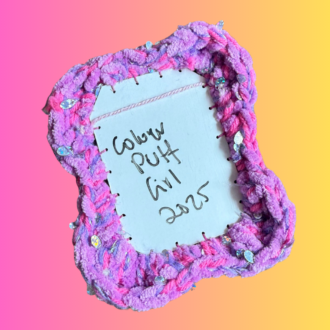 ColourPuff Girl wanted 2025 to be a time of connecting with her special interests and trying new things. She has been saving packaging from toys and pop culture items for a long time and her goal was to keep these in circulation and make cute art for your walls out of them! Packaging is seen as disposable and a marketing strategy, but have you ever looked properly at some packaging… It’s art! It was such a joy to create these pieces which came from treasured items in ColourPuff World. The whacky post modern style of frame tugs at 2000’s nostalgia and coupled with textural yarn these recycled beauties will bring so much whimsy in to your home. In the future these will be little relics from 2025 and the beginning of ColourPuff World. A time where ColourPuff Girl was making art on a dime, learning to create more circular and recycled art whilst also celebrating special interests! It has been a year since Stardust came out on the runway at the Australian Wearable Arts Fashion Festival. “Stardust” dropped the mask and helped ColourPuff Girl embrace her queer autistic self in her art and this collection is a direct connection to the liberation of creating from autistic joy.