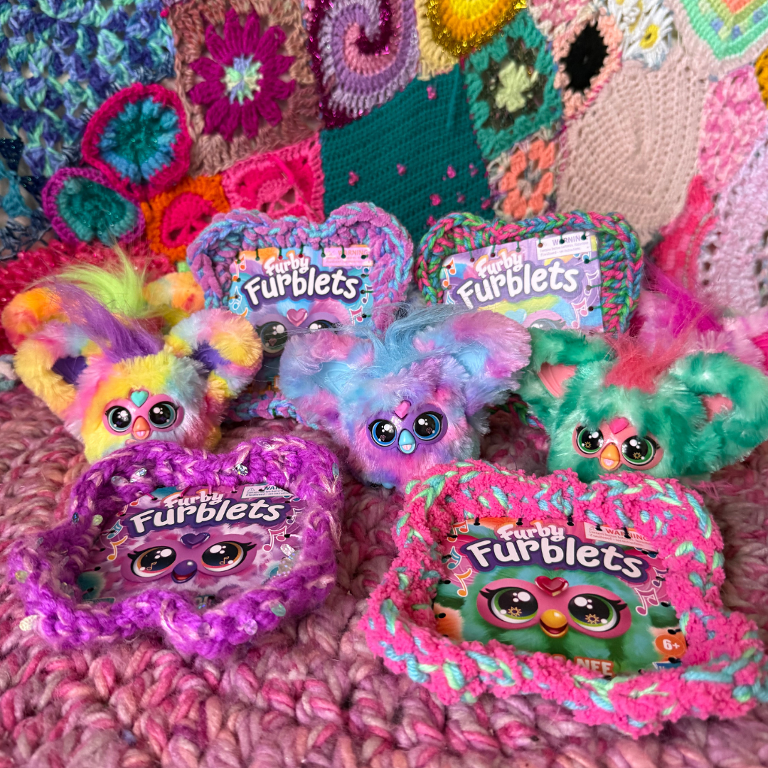 The Furby wall hangings are recycled from a line of furblets packaging aka baby Furbys which came out in 2024. ColourPuff Girl saved the packaging to make these adorable wall hangings. These baby furbys captured ColourPuff Girl’s heart and they are beloved residents in ColourPuff World.