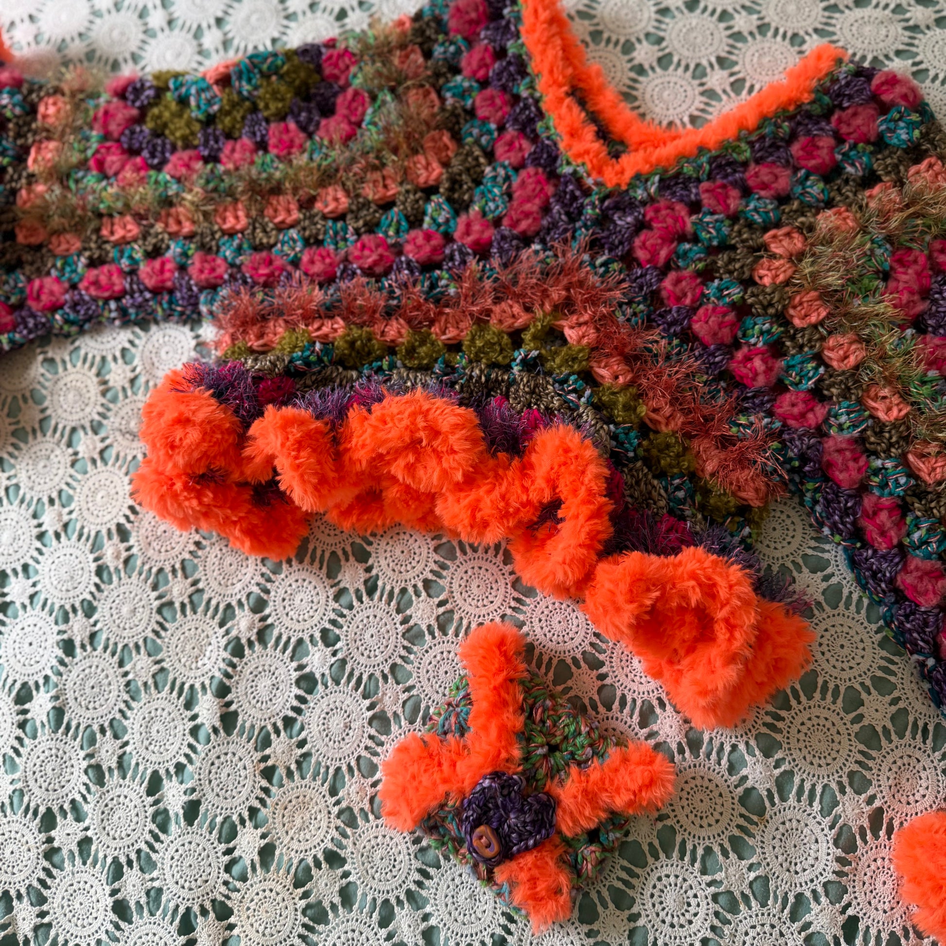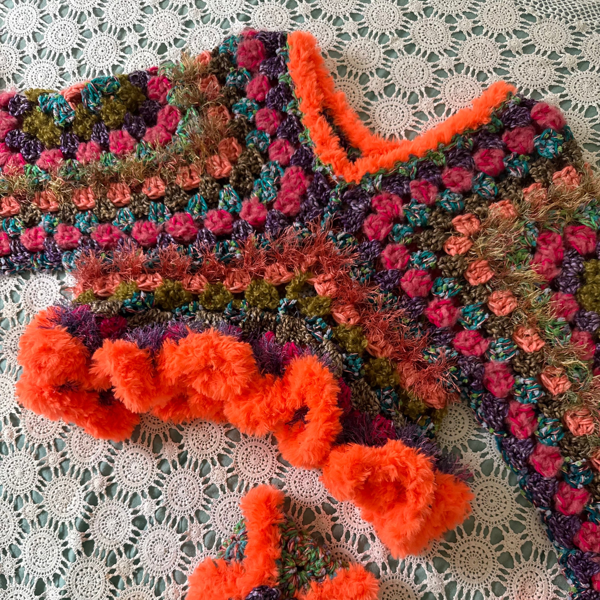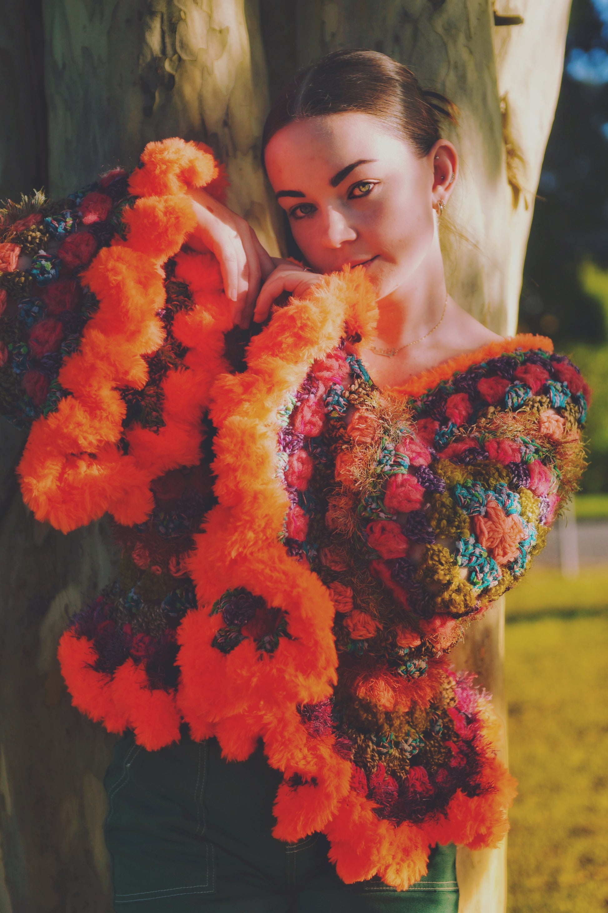 “Mango season” Came from the overwhelming feeling of nostalgia ColourPuff Girl has for mangoes. Growing up in Townsville which is in North Queensland, every summer the mangoes dominate. They are everywhere on trees and if you’re a local you would know of the Frosty Mango ice cream stop on the highway. Or if you’re from Brisbane, mango parfaits at The Big Pineapple. Picking mangos off the trees in blistering heat were the perfect fruit to eat on those hot days! This crop jumper bursts with colour and texture like the feeling of biting into a perfect Bowen Mango.