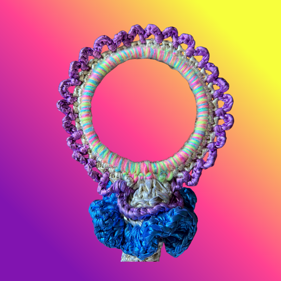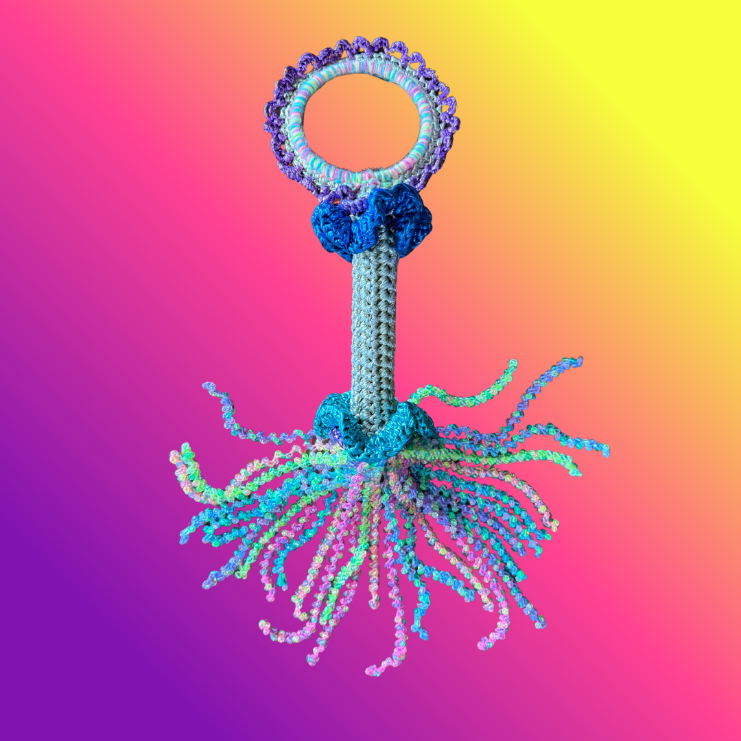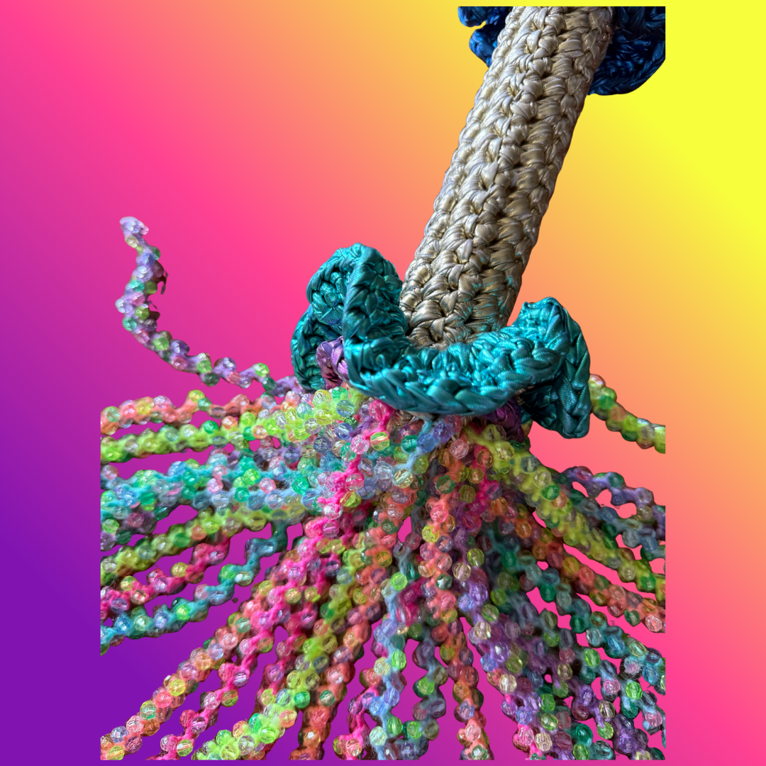 Rainbow daze is the incredibly visually stimulating. When the tails are moving, the haze of shimmery rainbows takes me back to seeing a rainbow just after a sun-shower. This flogger is a medium impact but is idea as a sensory flogger used to tease the fairy.