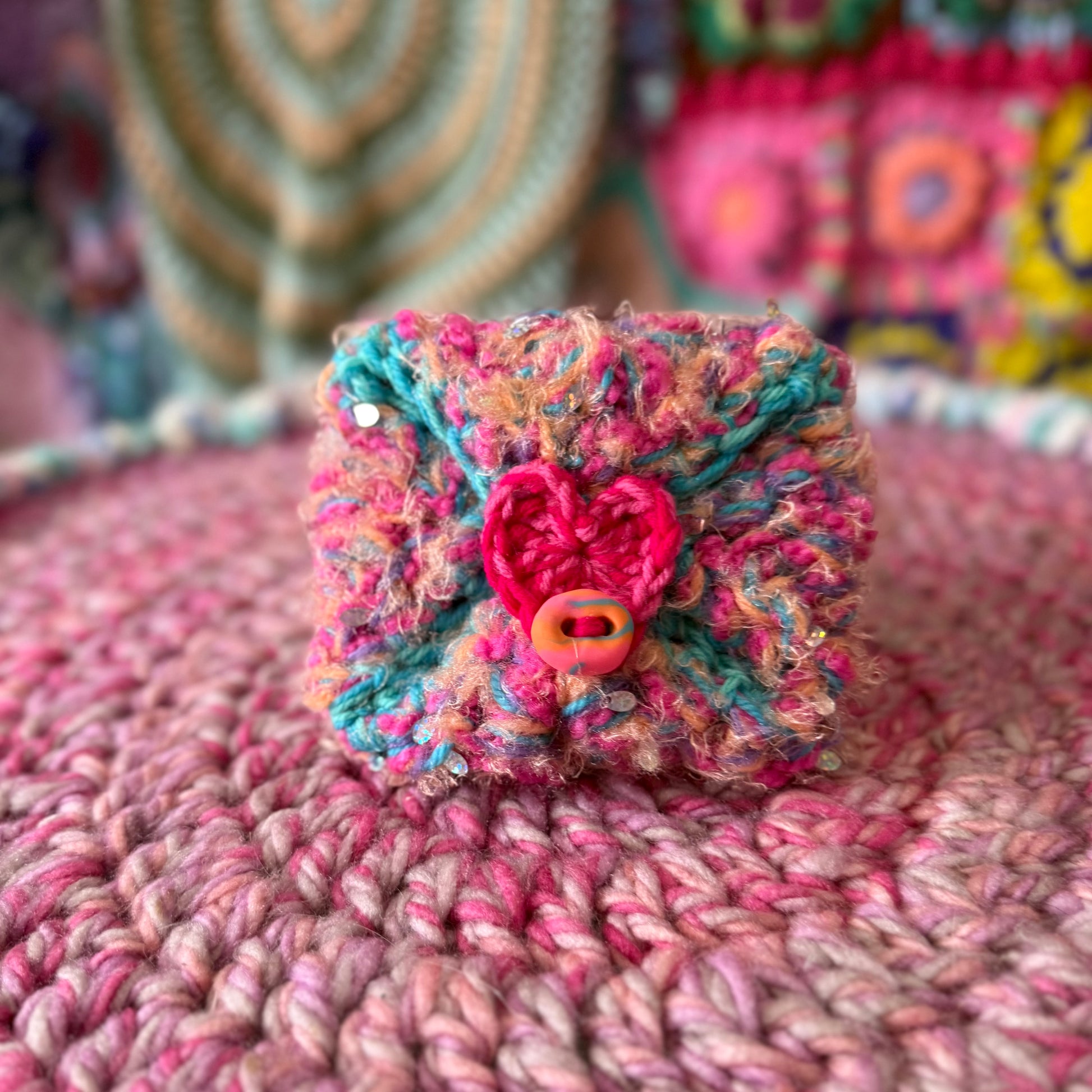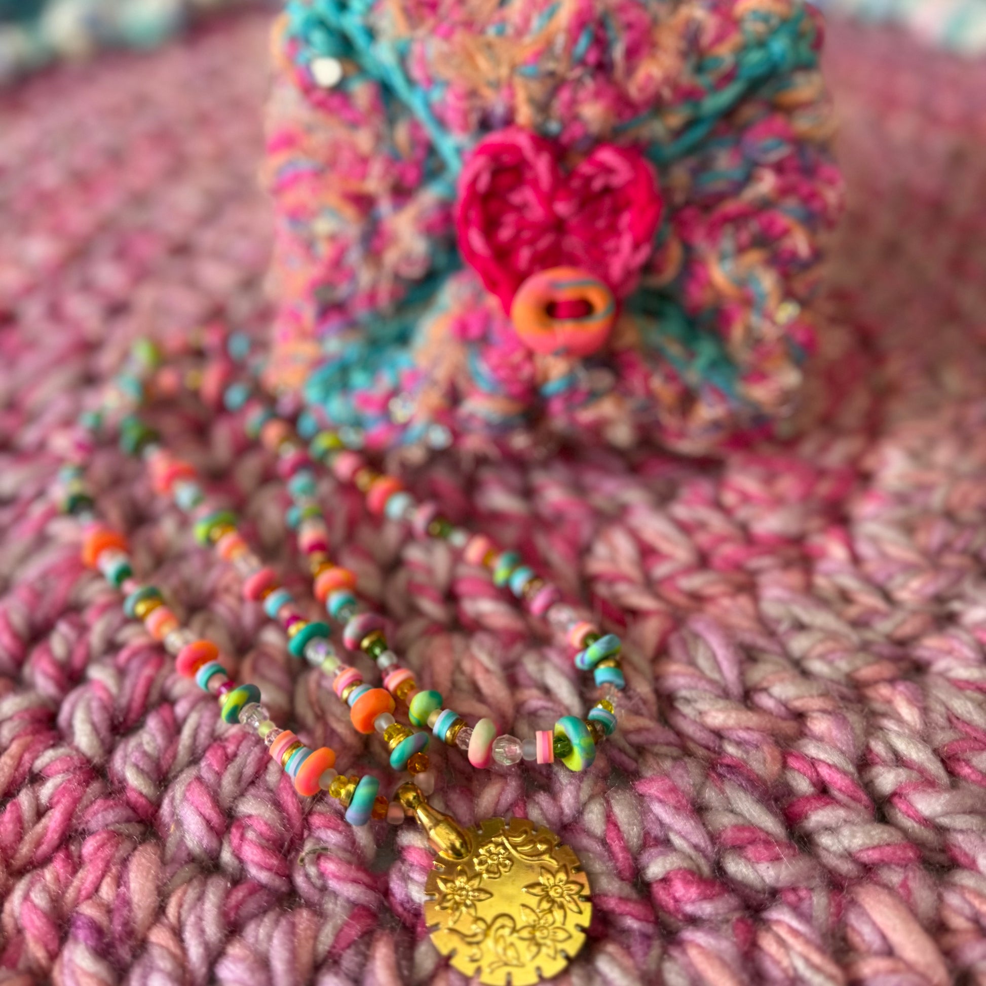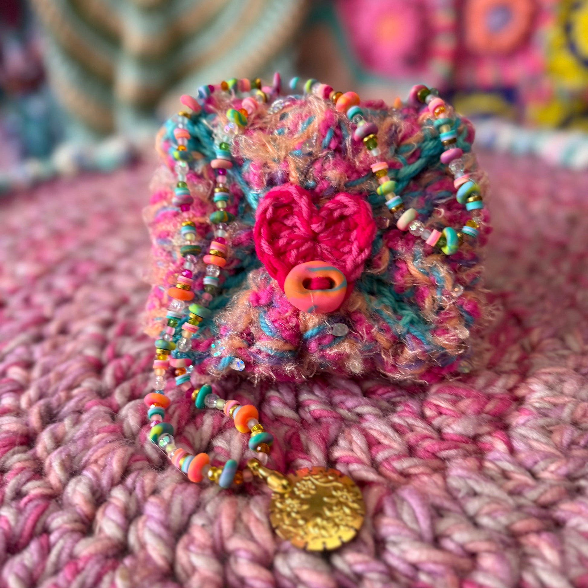 This Love Letter is about feeling the nostalgia of young love. It takes me back to my first love when I was 17. We would catch trains to the beach and on the way home we would eat sherbet fizzes and watch the twinkling lights of the city. All of the polymer clay beads are handmade in the ColourPuff Girl Studio. The yarn used for this project was leftover from a few wearable art projects “Dear Babushka” and “Acid Dreams”. This love letter set celebrates the innocence of young love. Being hopeful and excited to explore with love.
