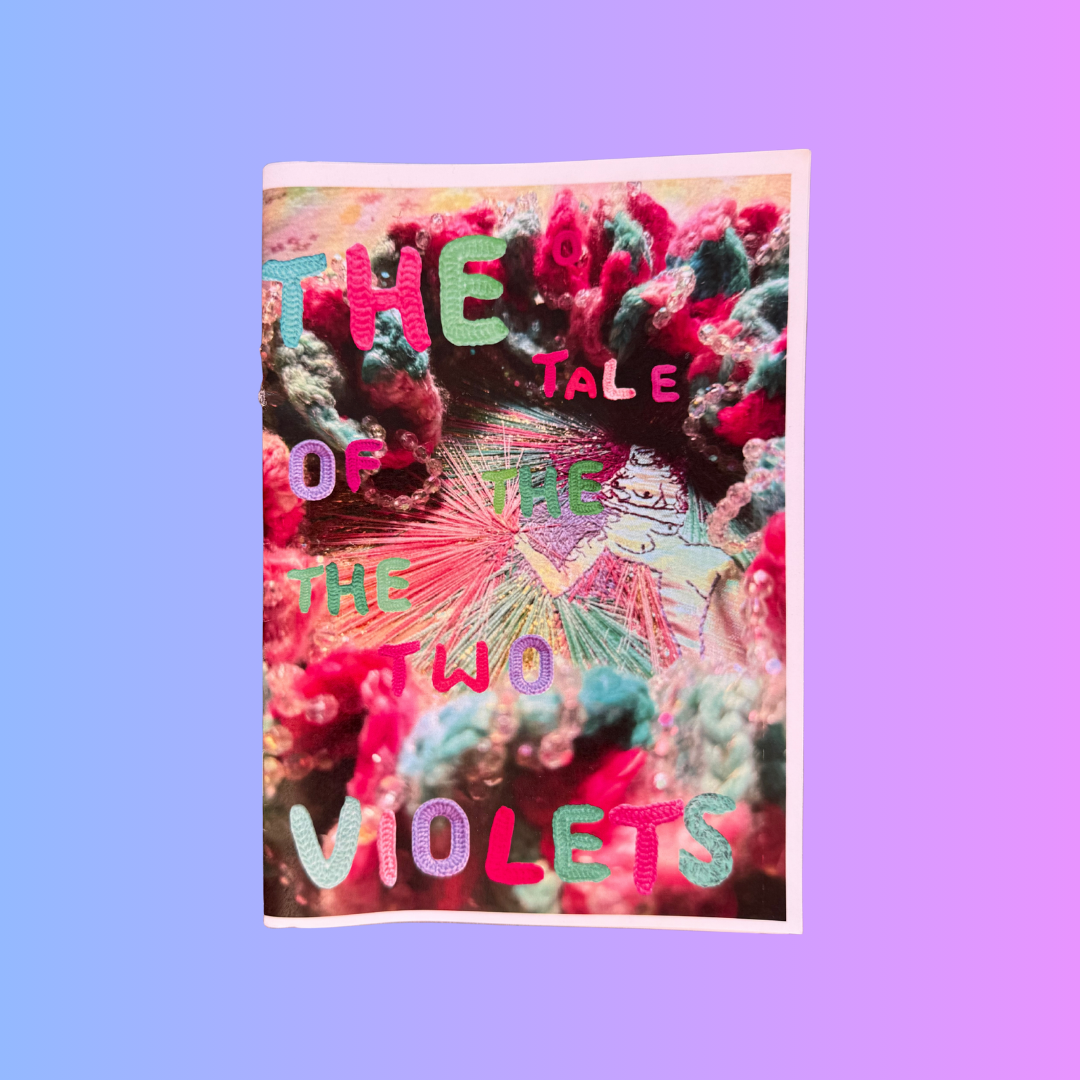 "The Tale of the Two Violets' zine is a collage of the embroidery collection made for "Sexy Gay Art" which was ColourPuff Girls debut in the queer art scene. This scene is made from the crochet alphabet that ColourPuff Girl spent months making at the beginning of 2025. Digitally using them in a collage pushed ColurPuff Girls concept of where crochet will venture in the future. Digital collages with crochet can extend the life of crochet and translate the softness to a new medium. This zine is beautiful and tragic and filled with art that has changed ColourPuff Girl for ever and if you are a lover girl, gay , guy or alien these pages will be familiar to you too.