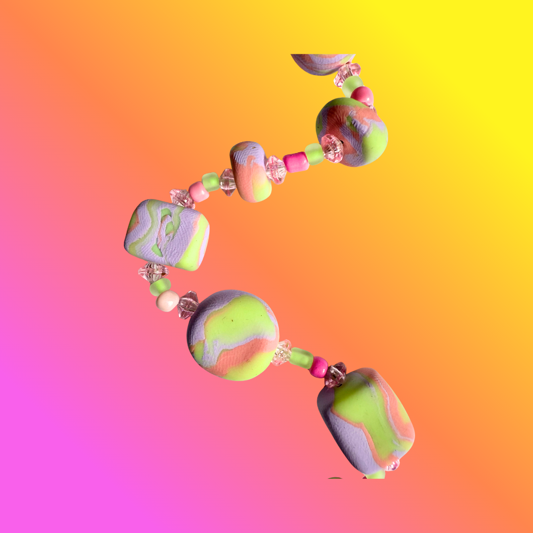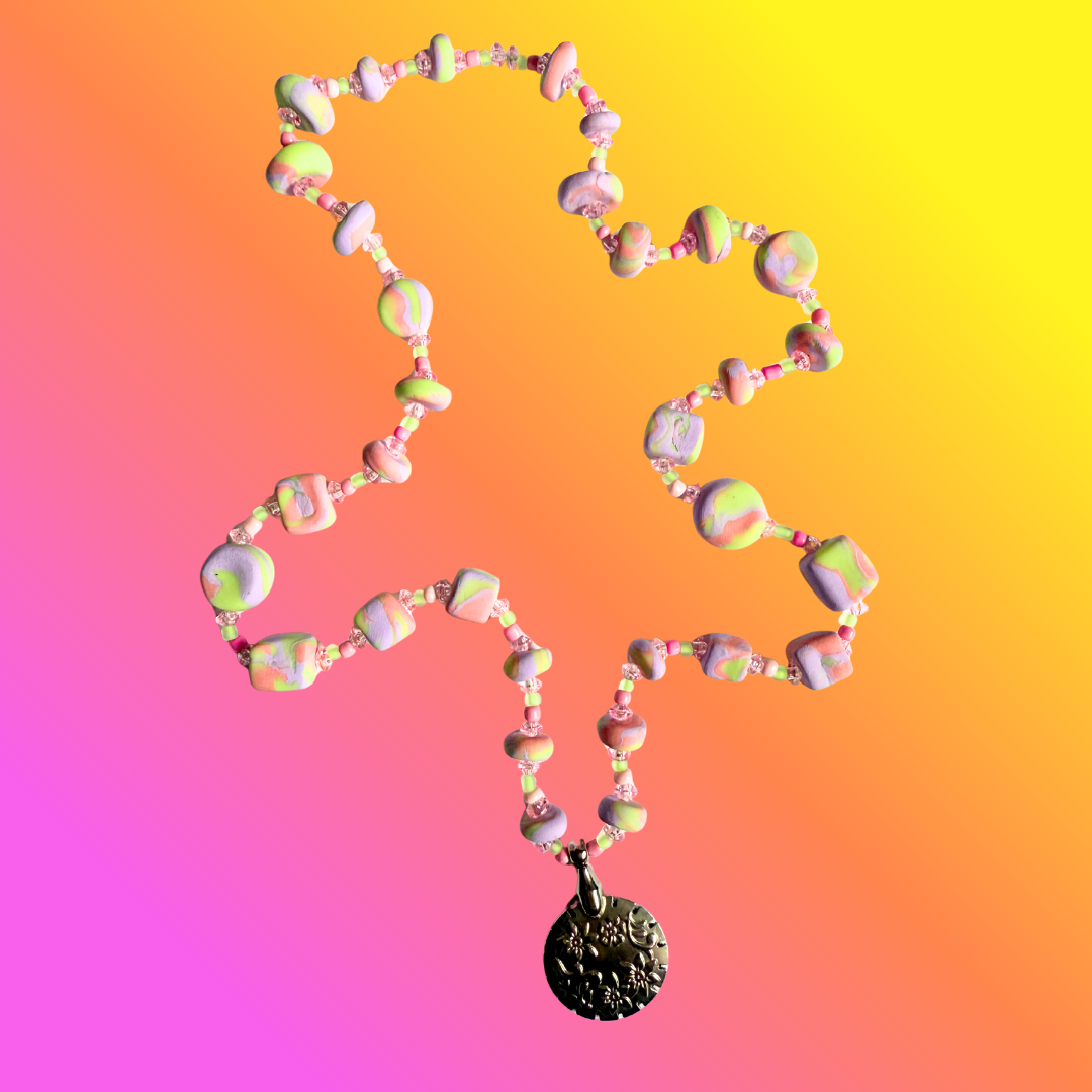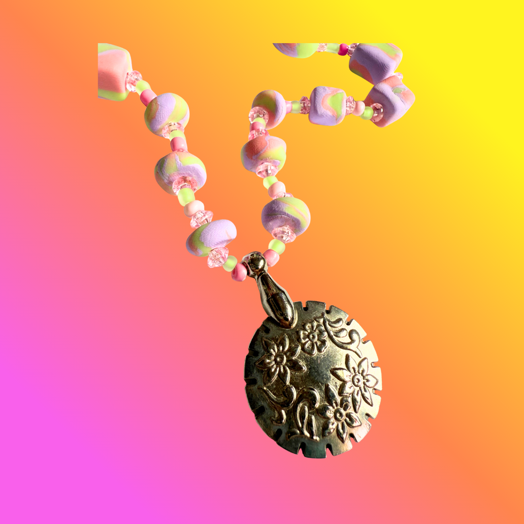 The polymer clay beads are mad with colour palettes that ColourPuff Girl loves and gives her joy! The colours in these beads are inspired by fields of lavender which she used to visit with her dad in Toowoomba where ColourPuff Girl was born! This pendant prompts you to sit with flowers, create outside and don't forget to smell the flowers! The yarn cutting pendant is hand beaded by ColourPuff Girl in her magical little studio in Meanjin.