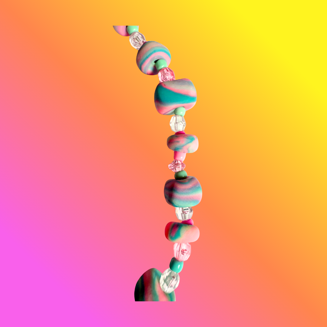 The polymer clay beads are made with colour palettes that ColourPuff Girl loves and gives her joy! The colours in these beads are inspired by the Colour Puff Girls favourite colour palette which is pink and turquoise. This colour palette has been seen in multiple pieces of art she has made and is a core magical energy to her practise . The yarn cutting pendant is hand beaded by ColourPuff Girl in her magical little studio in Meanjin.